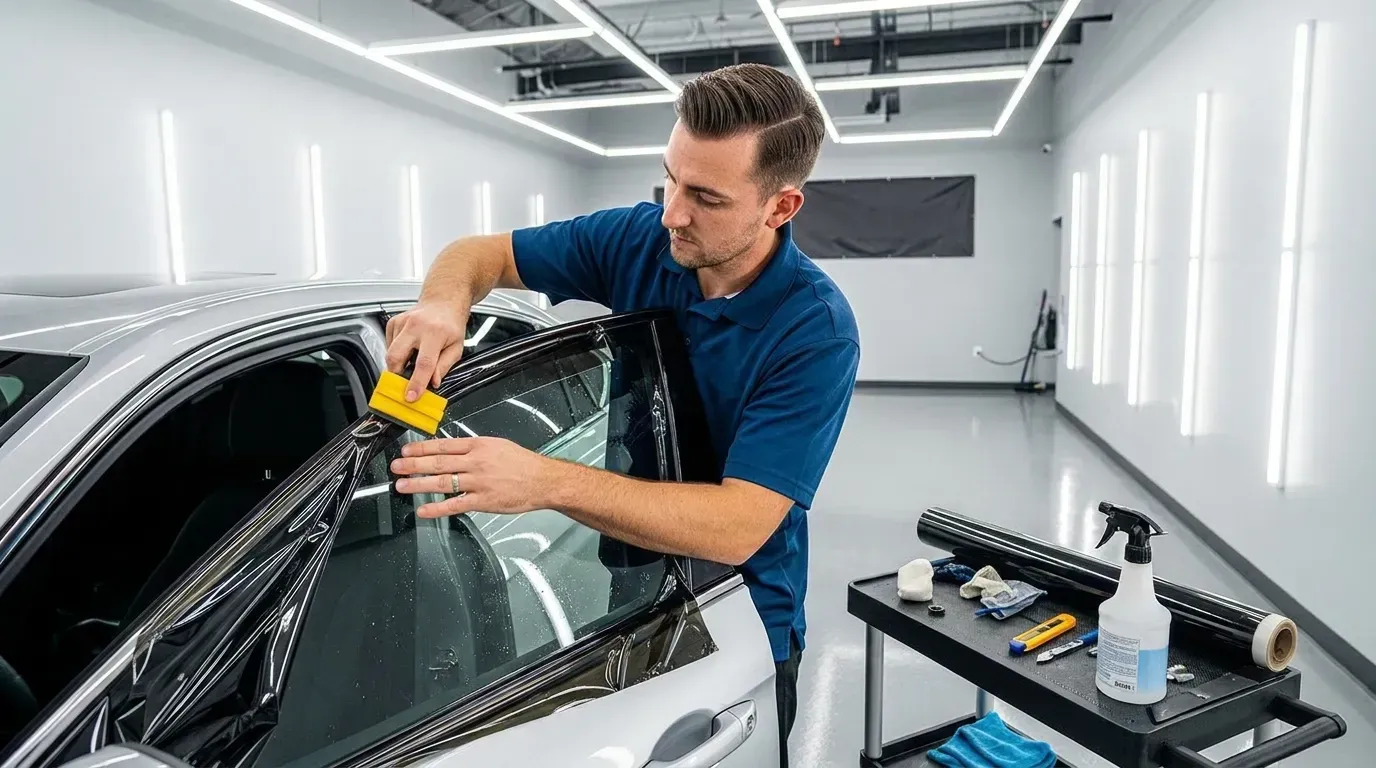 The installation process begins with an intensive cleaning of the interior glass. Technicians use specialized solutions and scraping tools to strip away any grease, dirt, or leftover residue from factory stickers. Next, the film is custom-cut to match the exact dimensions of your vehicle windows. Installers then use a heat gun to carefully shrink the film, molding it perfectly to the compound curvature of the glass.